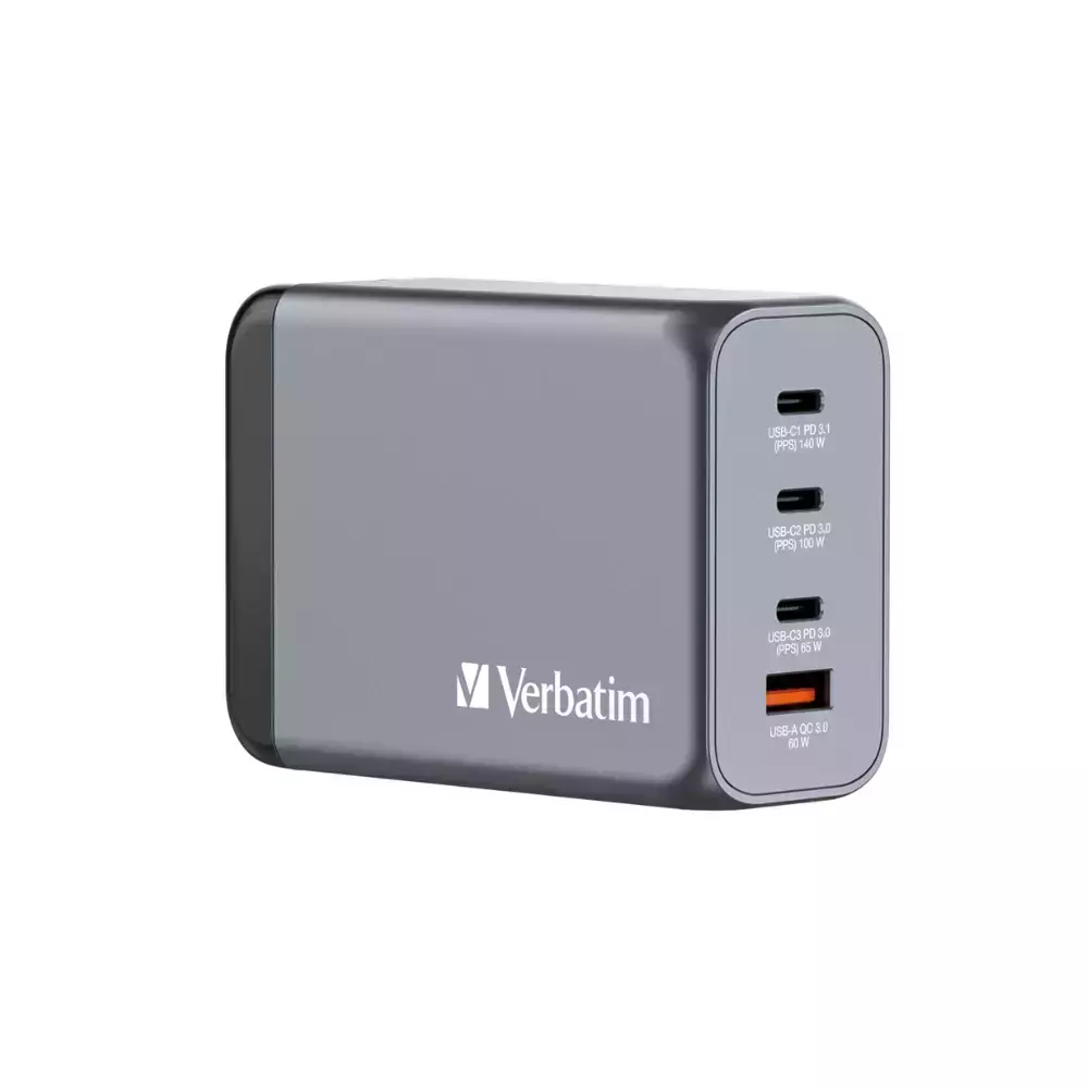 El cargador de pared GaN de 240 W de Verbatim combina tres puertos USB-C PD y un puerto USB-A QC 3.0 en un diseño elegante que cabe en la palma de la mano.
